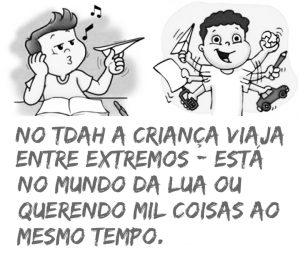 As crianças o TDAH são agitadas, hiperativas, desajeitadas, costumam quebrar objetos, não propositadamente, mas pela falta de jeito, ficam “a mil por hora” e para dormir parece que “desligam a bateria” repentinamente. Em geral essas crianças têm resistência a dor e a mãe nota que os beliscões não têm muito efeito nelas. Elas não prestam atenção, são muito conversadeiras, esquecem e perdem objetos, não terminam o que começam, não se integram nas brincadeiras infantis, não seguem regras.